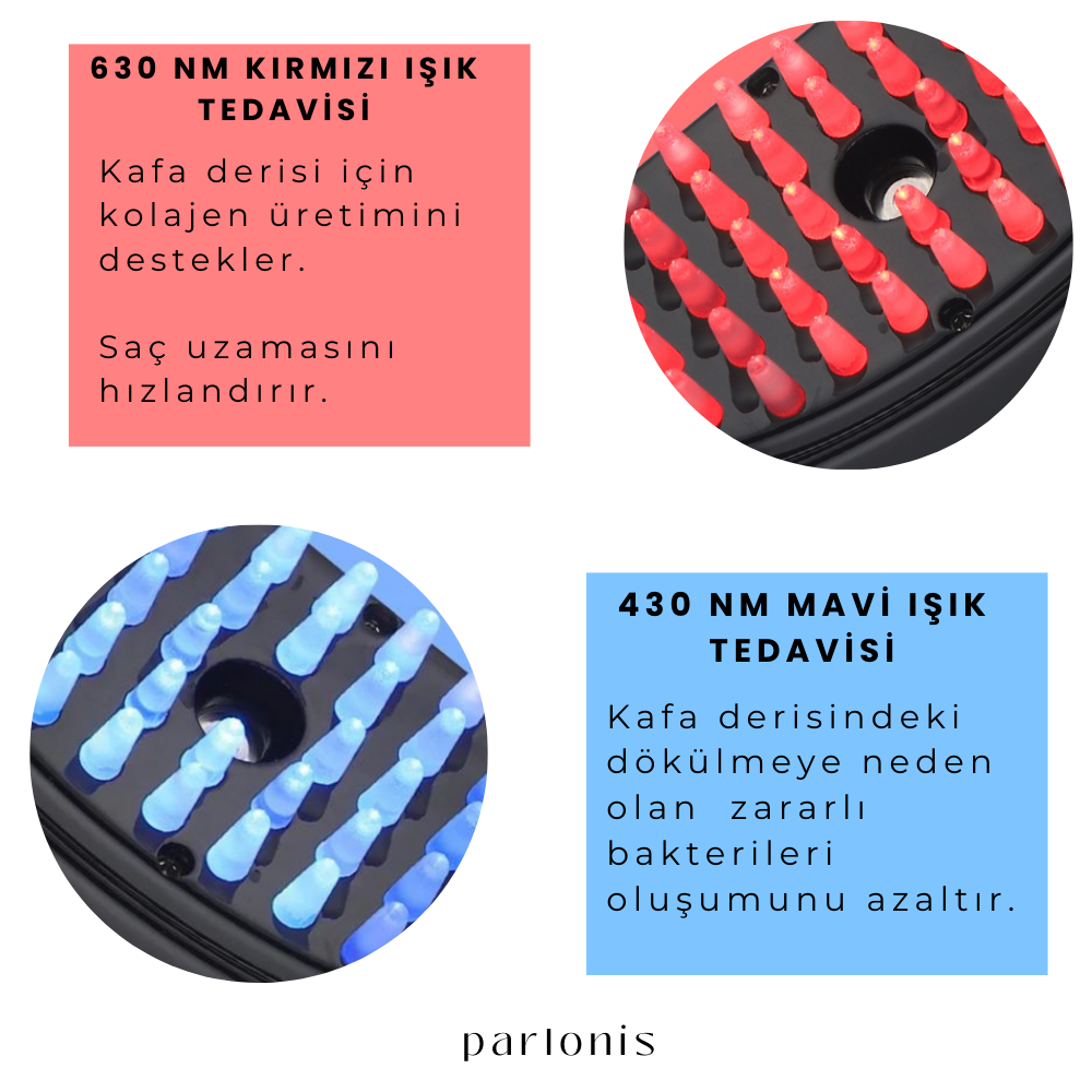 Sağlıklı ve güçlü saçların korunmasına yardımcı olan yenilikçi terapimiz burada devreye giriyor . Parlonis Saç Bakım Tarağı, dermatolojide olağanüstü özellikleriyle bilinen mavi ve kırmızı ışık terapisini , saç yağını buharlaştırıp doğrudan saç derinize verme yeteneğiyle birleştirir . Ayrıca masaj fonksiyonu gözeneklerin açılmasını sağlayarak yağın emilimini önemli ölçüde artırır .